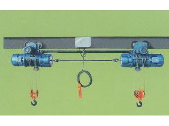 最大40t+40t,手动电动两用,机械电气同部。双吊点电动葫芦产品 QBH 型双吊点电动葫芦是我公司根据市场需求研发的一种水利闸门启闭用的专用设备,也可用于类似抬吊的场合。 示例:QBH5+5-18-B指双吊点5t+5t起升高度为18米的运行式电动葫芦。 特点 该设备通过机械及电气同步,通过万向节连接,强制起升电机转速同步,而且两台电动葫芦采用一套电气控制系统,克服了电气动作误差,从而保证两台电动葫芦同时升降起吊重物,另外,设备组合方便,便于增加如超载限制、高度显示及遥控等辅助功能。 业绩 河北水利水电管理局水工一处,郑州起重机械公司,南京钢铁公司,衡阳钢管厂,杭州钢铁公司,杭州机械设计研究院,邯郸钢铁公司,北京水工机械厂等。